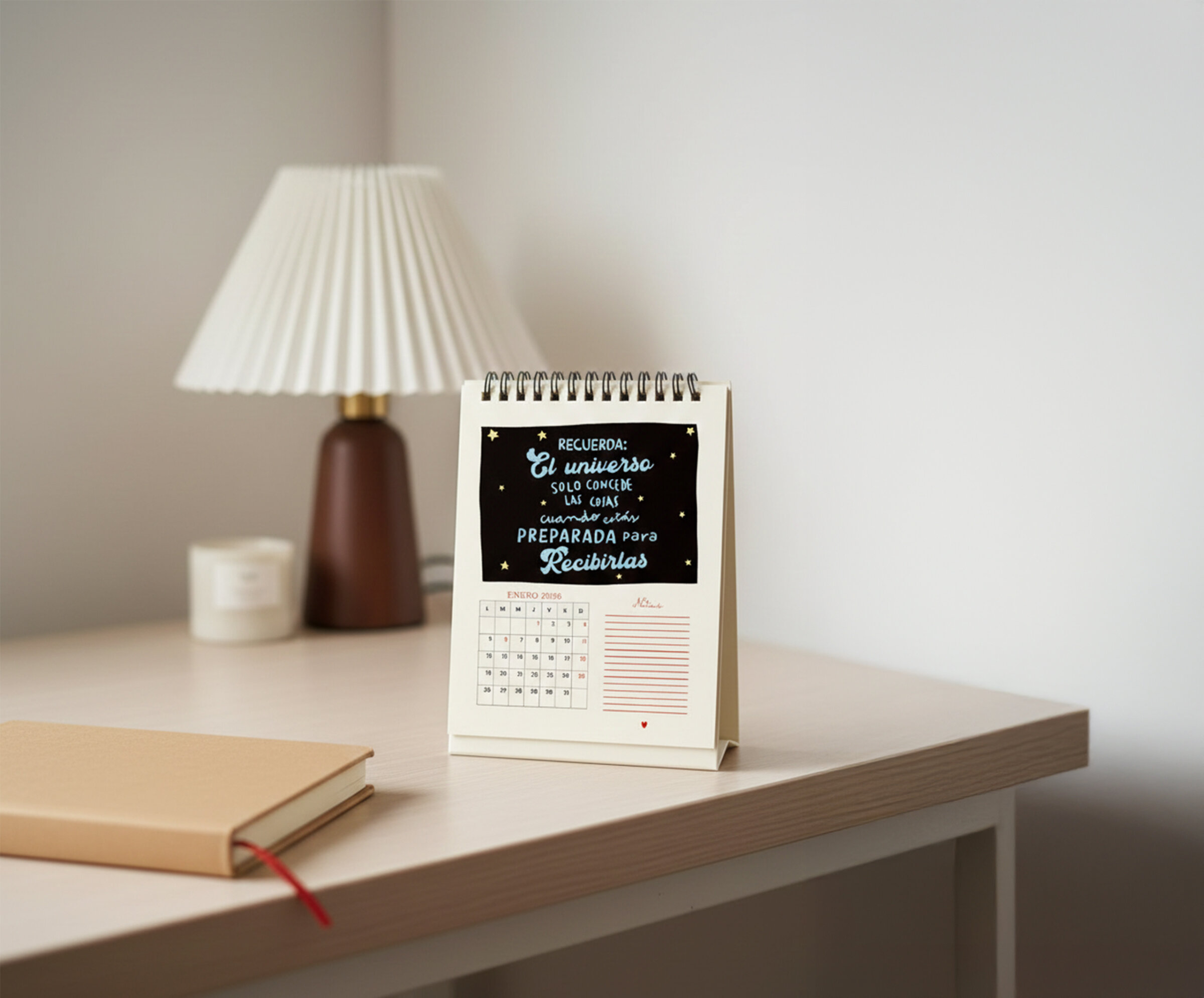 Con un formato compacto (18 cm de alto x 14 cm de ancho), está pensado para acompañarte cada día sobre tu escritorio, mesa de trabajo o mesilla, aportando inspiración y belleza sin ocupar demasiado espacio.